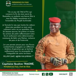 En ce jour de l’Aïd el-Fitr qui consacre la fin du mois sacré du Ramadan, je souhaite une bonne fête à tous les fidèles musulmans et à l’ensemble du Peuple burkinabè.